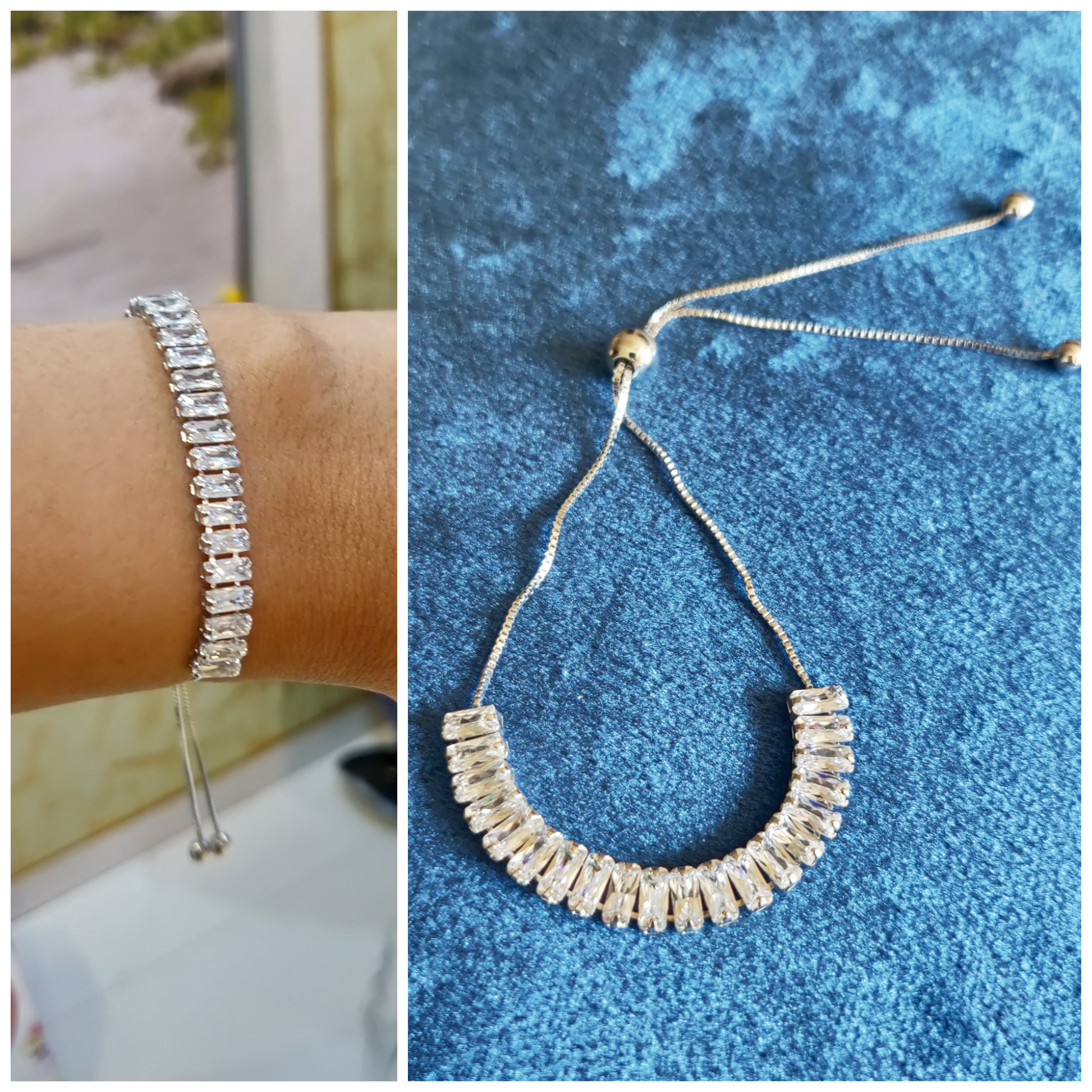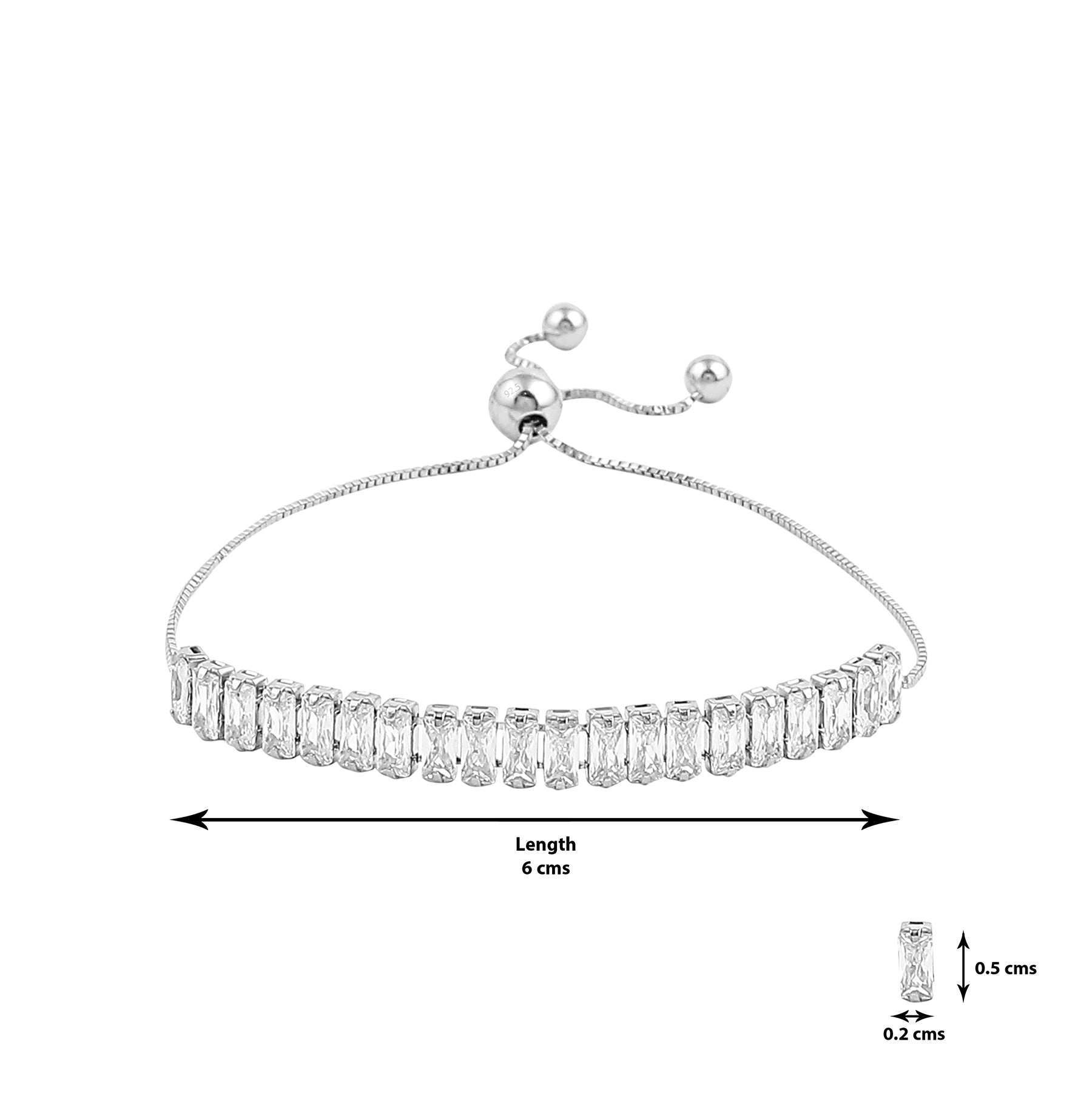 This dazzling piece of silver wonder is adorned with brilliant cubic zirconia stones and has a unique pull-chain clasp which can be easily adjusted to fit any size. Exuding classy elegance, this delicate bracelet is perfect to flaunt your extravagant style!