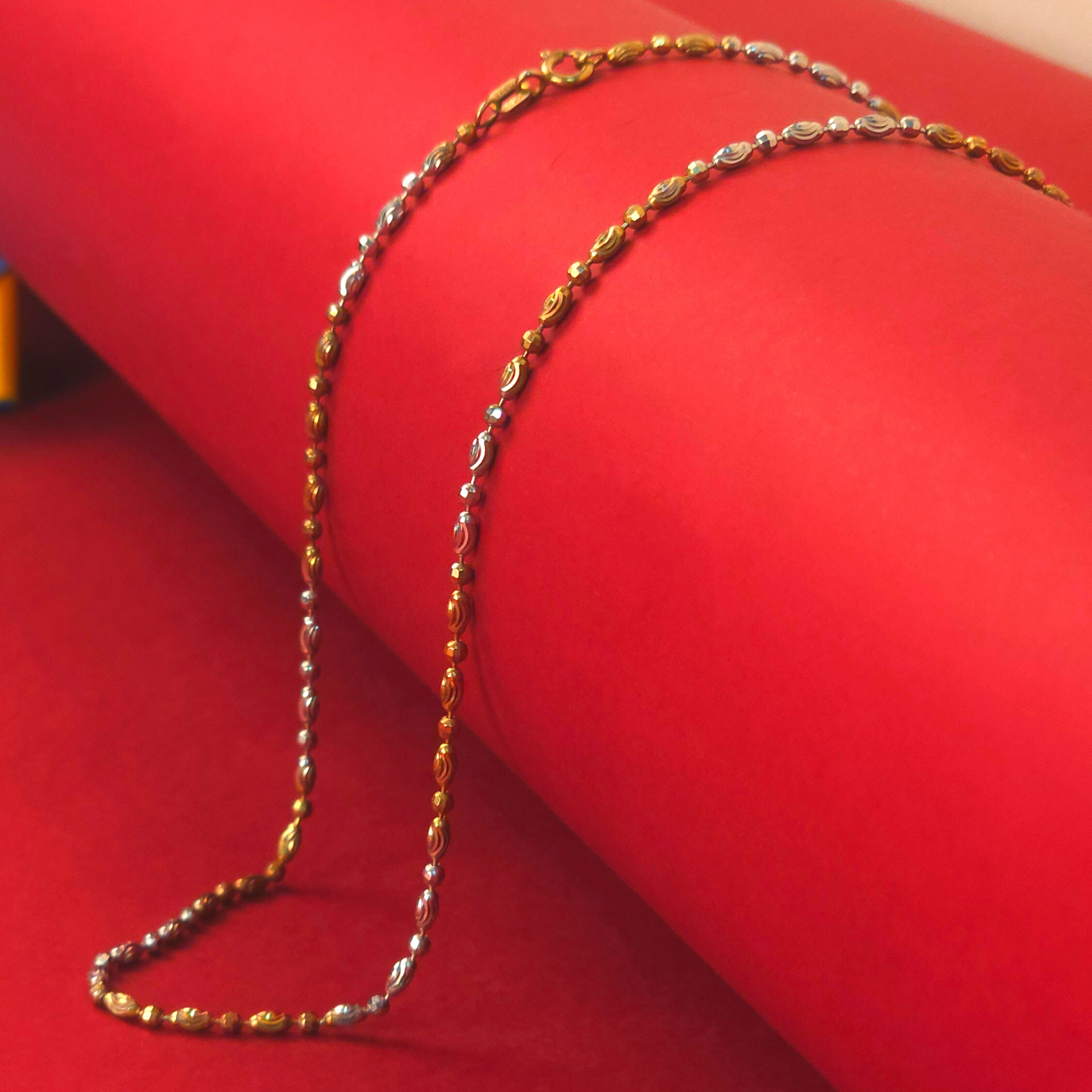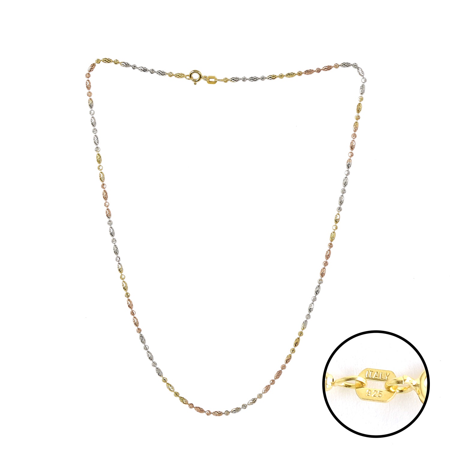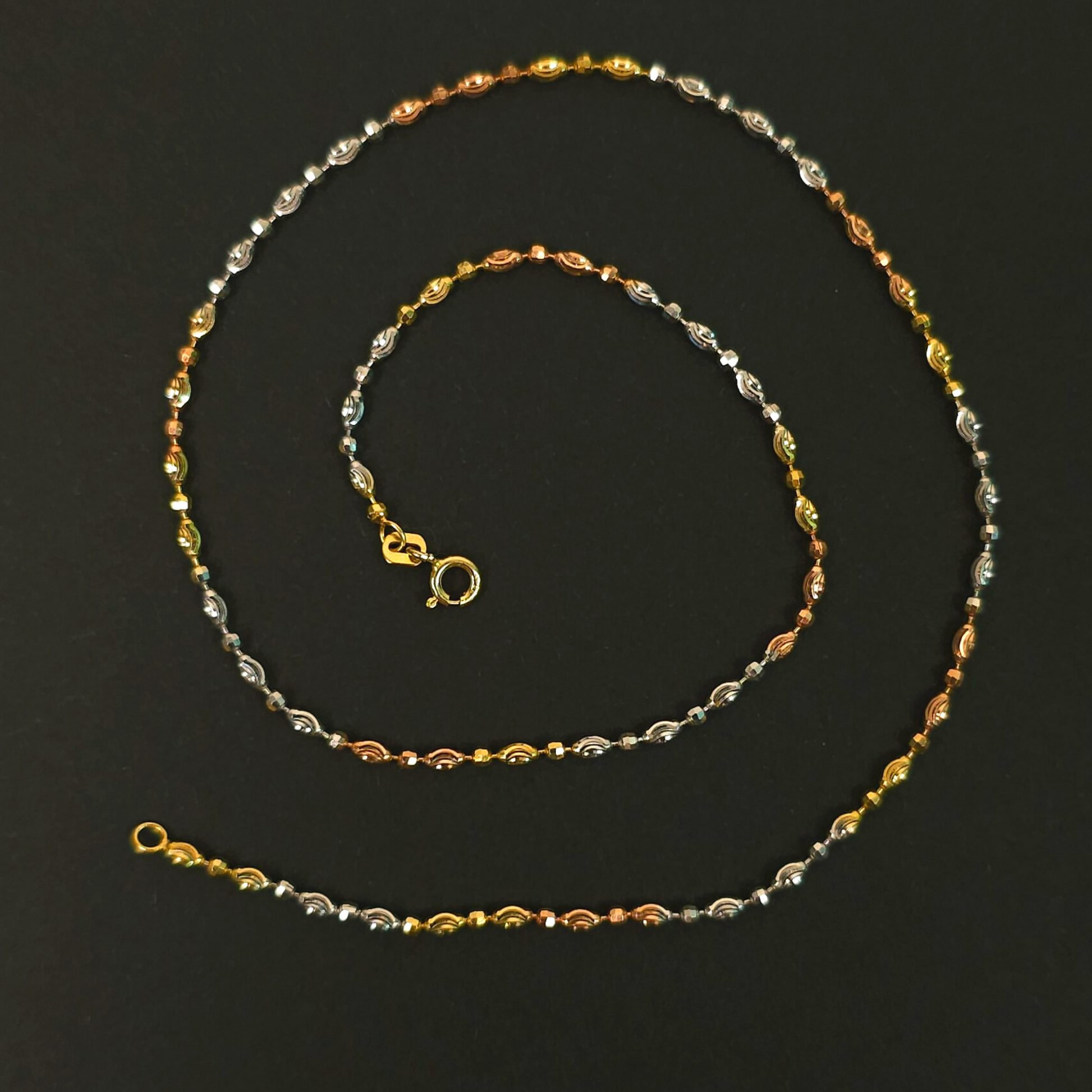 The scallop design chain features alternating barrels and interlinking chains of silver, gold and rose-gold finish to create a stunning contrast. Because of it’s multi-tone shades, this chain is a versatile addition to your accessories.Wear it solo or with a beautiful pendant and make a remarkable minimalist statement!
