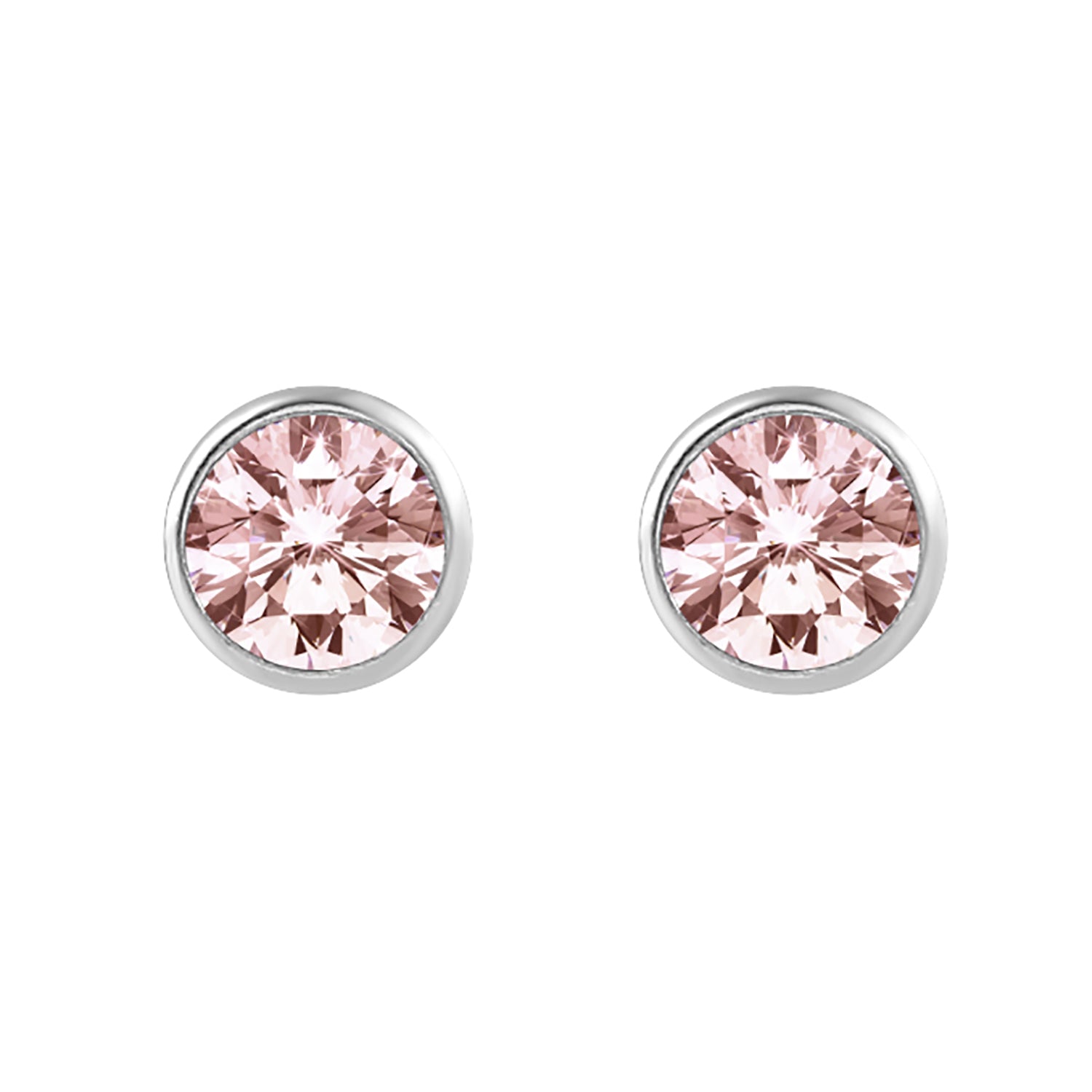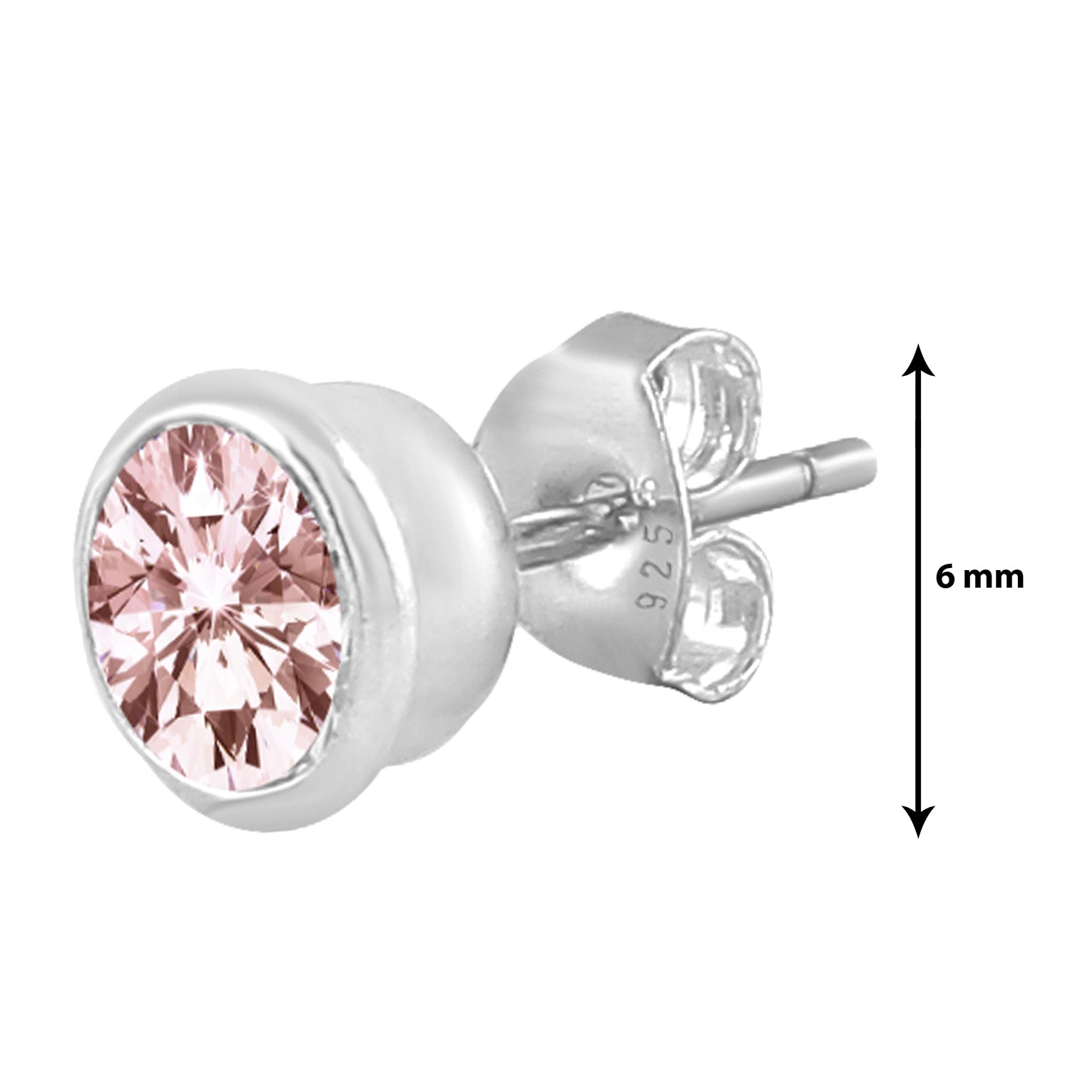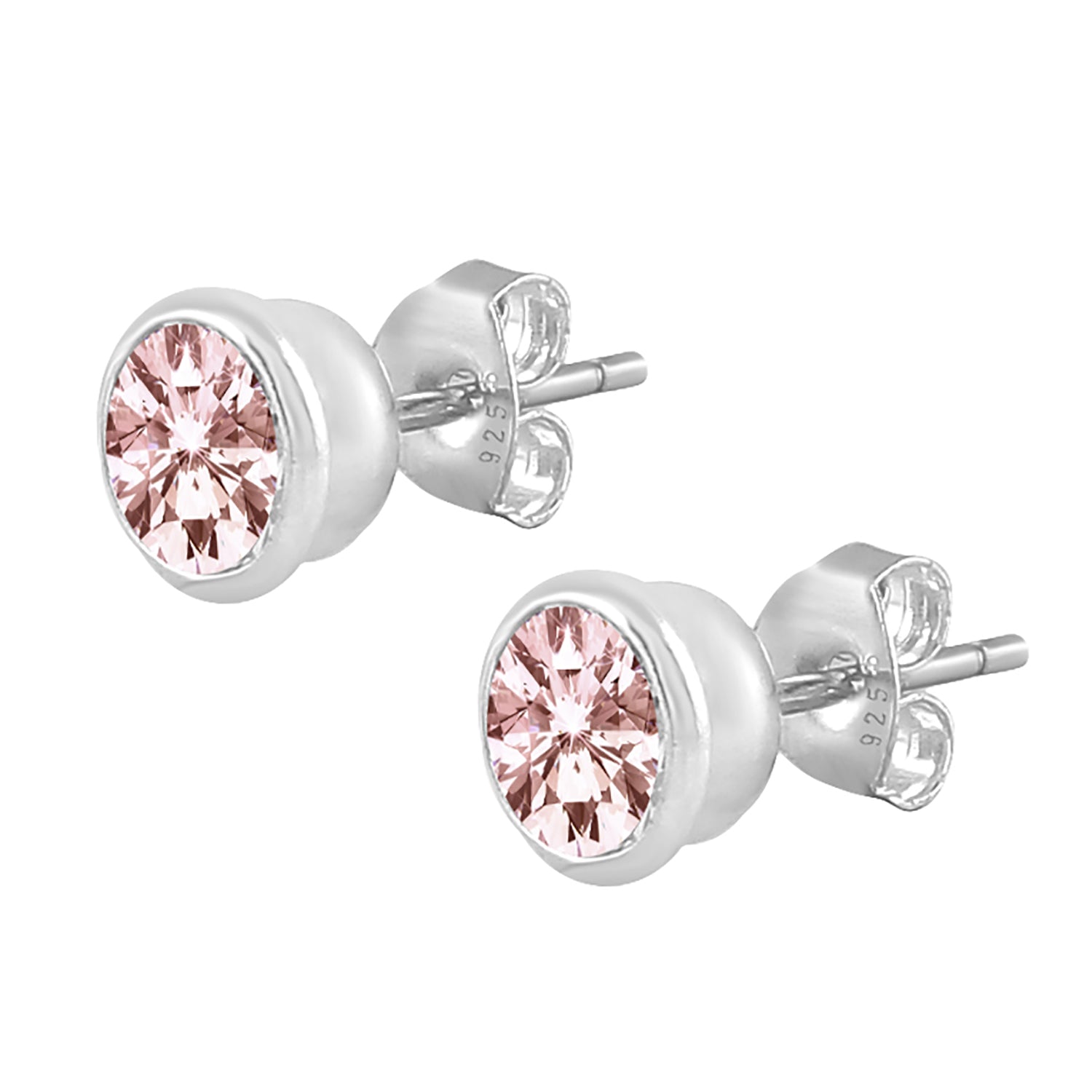 While small in size, these silver studs are anything but diminutive in sparkle! Lights bounce off the pink cubic zirconia stone as it comfortably glistens in a rhodium-plated bezel setting. Feminine and elegant, these studs work equally well with formal or informal outfits.
