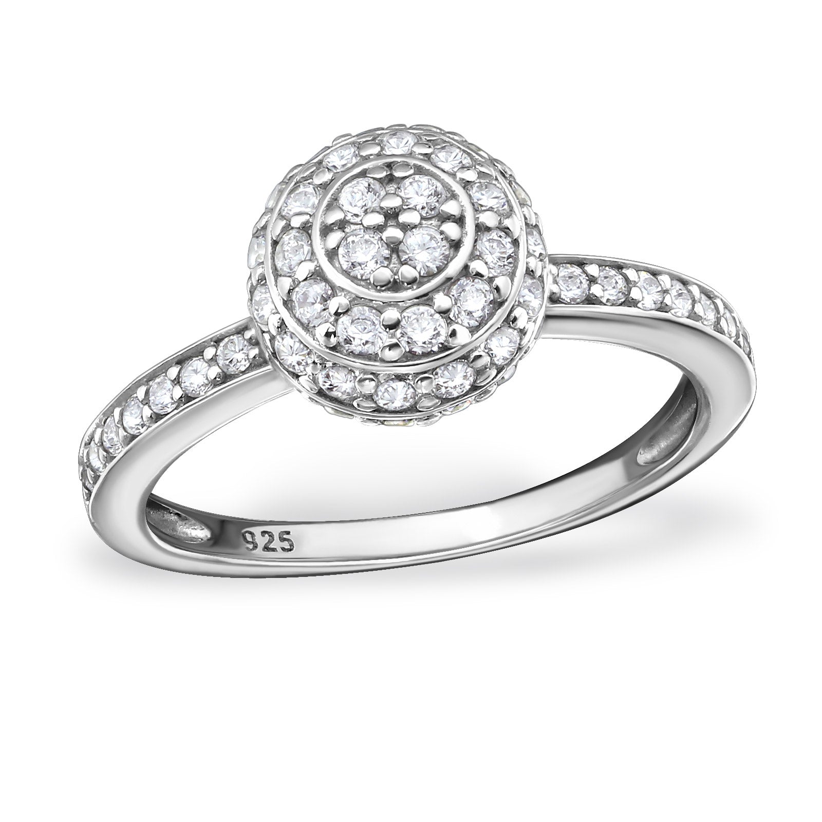 Like a delightfully cut pom pom chrysanthemum with it’s small, tightly clustered petals, this rhodium plated ring, will spread cheer and liveliness in your life. Lavished with glistening round-cut cubic zirconia stones in a patterned cluster, this silver floweret makes for a blossoming statement.