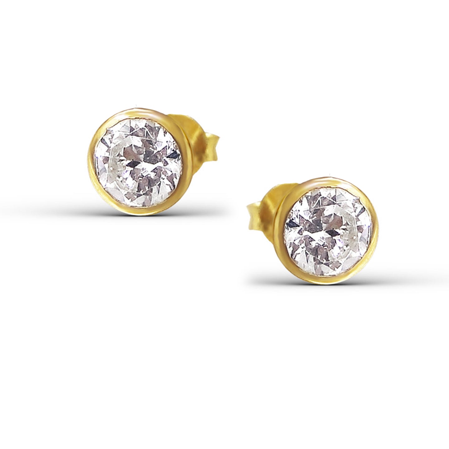 Exude style with these cubic zirconia bezel set sterling silver studs! Dazzling round cut stone, placed in a prong setting, these studs are polished to perfection in gold plating and will surely set your face aglow!